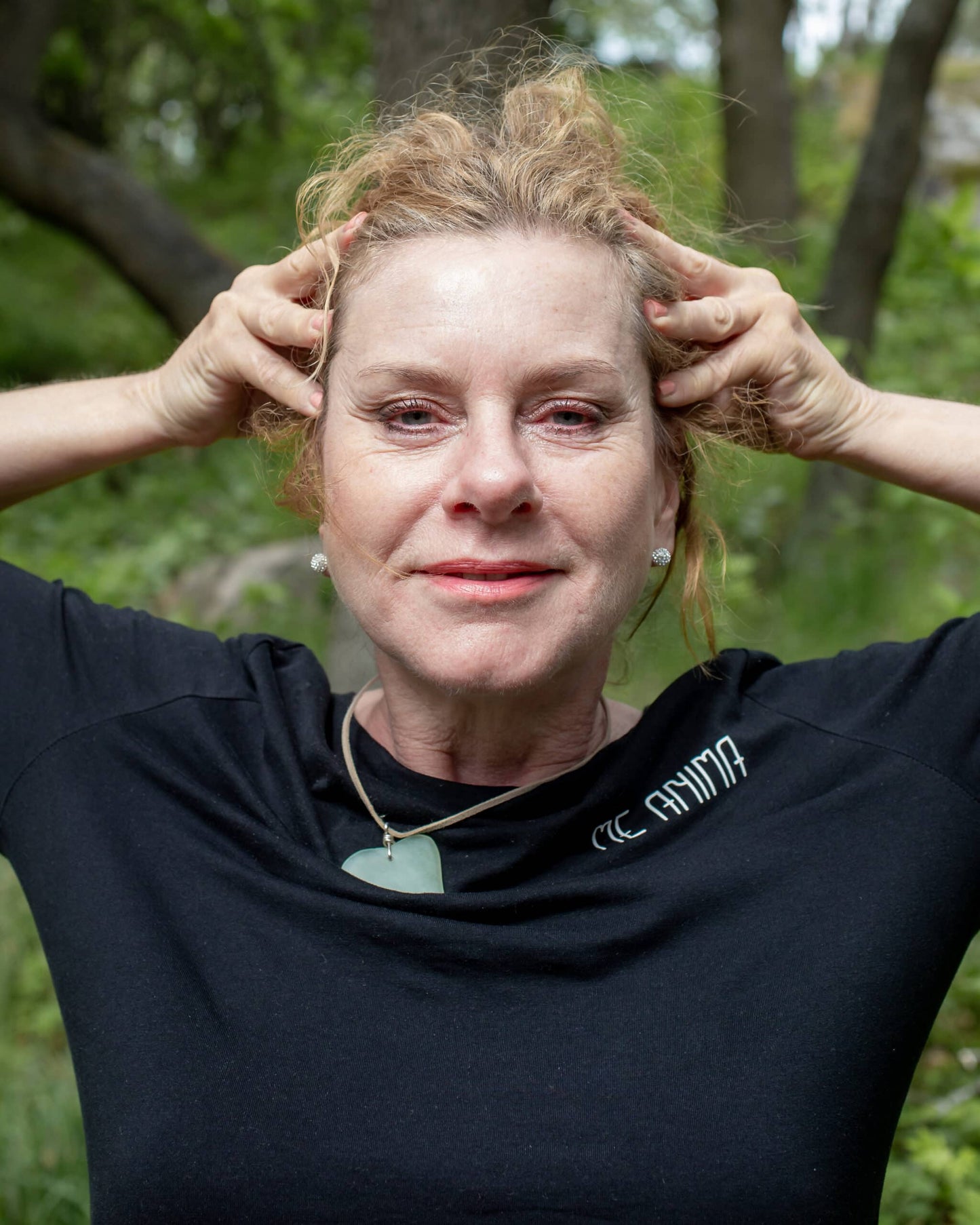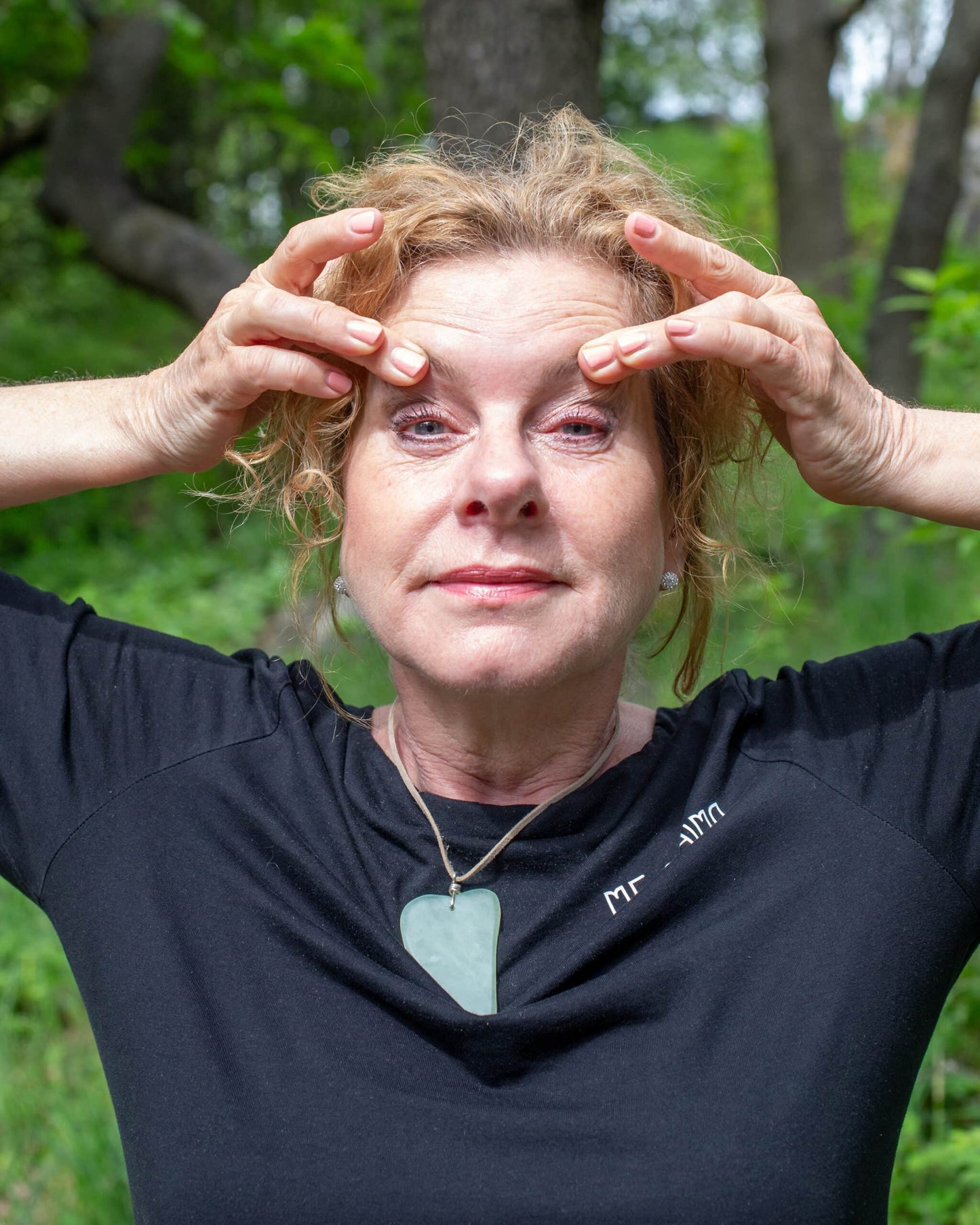 22. Now we stretch by taking both palms and pressing the skull together from the sides towards each other upwards and then palms from the forehead forward and hold the back of the scalp. It feels so good to press and stretch out.
